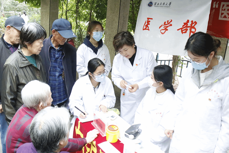 活动中,学部师生充分发挥专业优势,耐心为老人们测量血糖、血压和检查口腔,询问身体状况、过往病史以及生活习惯等,并因人而异提供专业医疗建议,确保老人们能全面了解自身健康状况。同时,志愿者们还积极向社区居民普及健康知识,详细介绍定期进行身体检查的重要性。志愿者们通过通俗易懂的语言和生动的案例,向社区居民讲解疾病预防知识和保持健康生活方式的重要性,提高了居民们的健康意识。